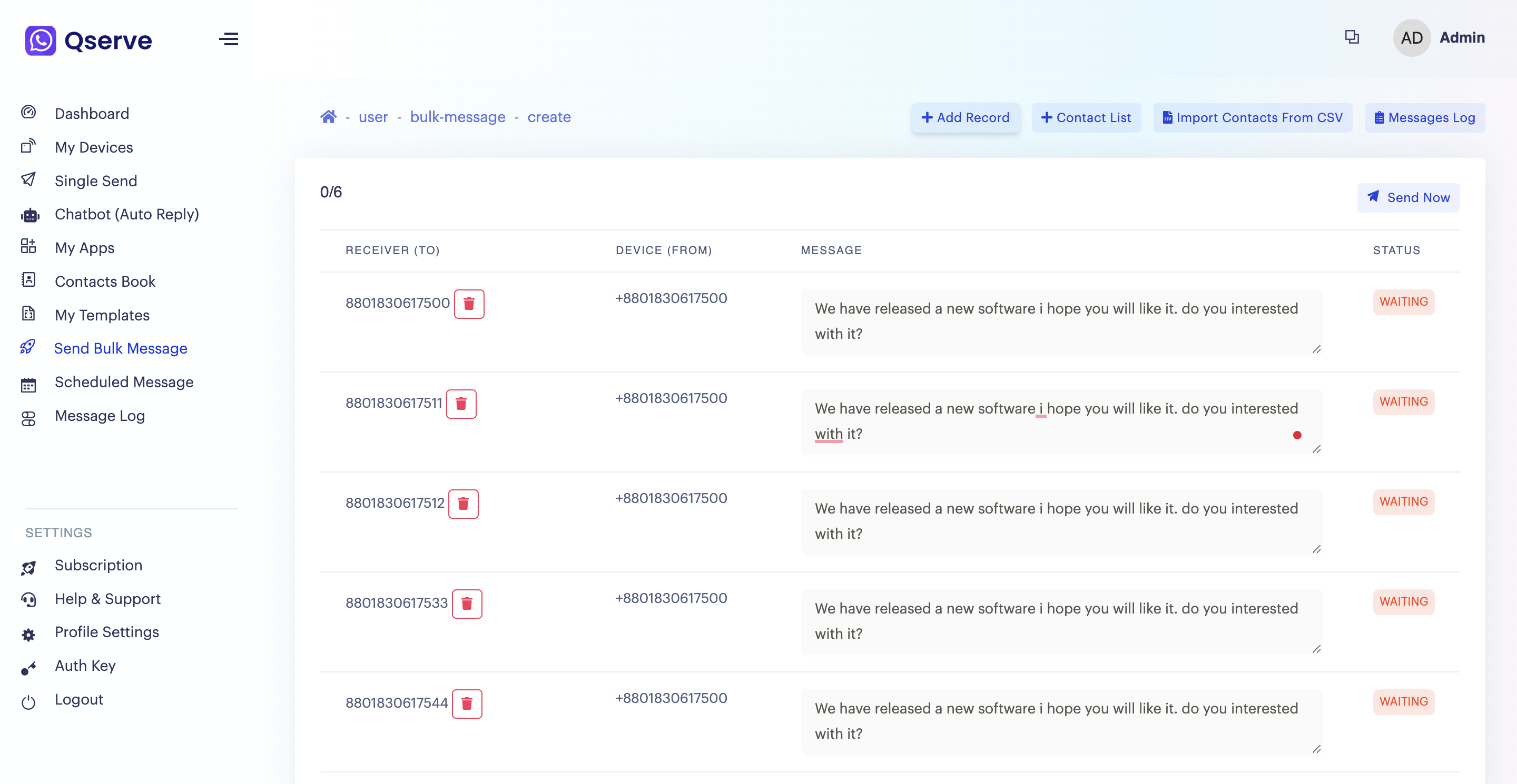 O envio de mensagens em massa pelo WhatsApp (WA Bulk Messaging) é a disseminação de um grande número de mensagens para entrega ao software WASender. É utilizado por empresas de mídia, bancos e outras empresas e marcas de consumo para uma variedade de propósitos, incluindo entretenimento, marketing empresarial e marketing móvel.